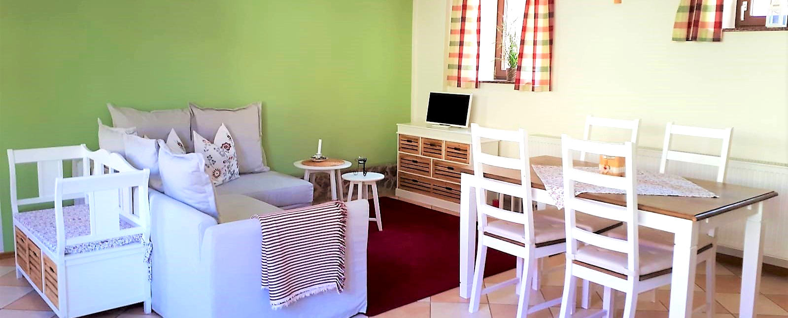 You can also use the family atmosphere of our farm for your family reunions or holidays with friends. Our 4 apartments offer you the ideal conditions for this. You have the opportunity to spend time together and still have your own retreat. In the opposite building of our 3-sided courtyard are the holiday apartments "Kräuterstübchen" and "Frühlingswiese", each with a double bed and the possibility of adding an extra bed or connecting the two apartments through a connecting door. In addition, our apartment "Landliebe" is located on the 1st floor for up to 6 people. Please contact us, we will find the best variant for you!